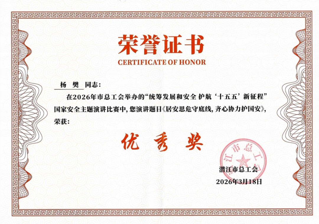 为大力开展国家安全教育,增强广大职工群众国家安全意识和素养,筑牢国家安全职工防线。3月18日,潜江市总工会在江汉艺术职业学院图书馆5号报告厅举办“统筹发展和安全,护航‘十五五’新征程”主题演讲比赛。来自全市各条战线的55名选手参加比赛,产发集团选派选手杨樊紧扣主题、语言流畅、沉稳从容,经过激烈的角逐,最终获得本次演讲比赛优秀奖。